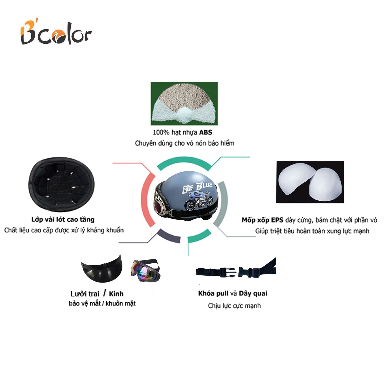 B’Color là nhãn hiệu mũ bảo hiểm dành cho giới trẻ, đáp ứng đầy đủ các tiêu chuẩn về kỹ thuật và an toàn do Tổng cục Tiêu chuẩn Đo lường Chất lượng cấp.