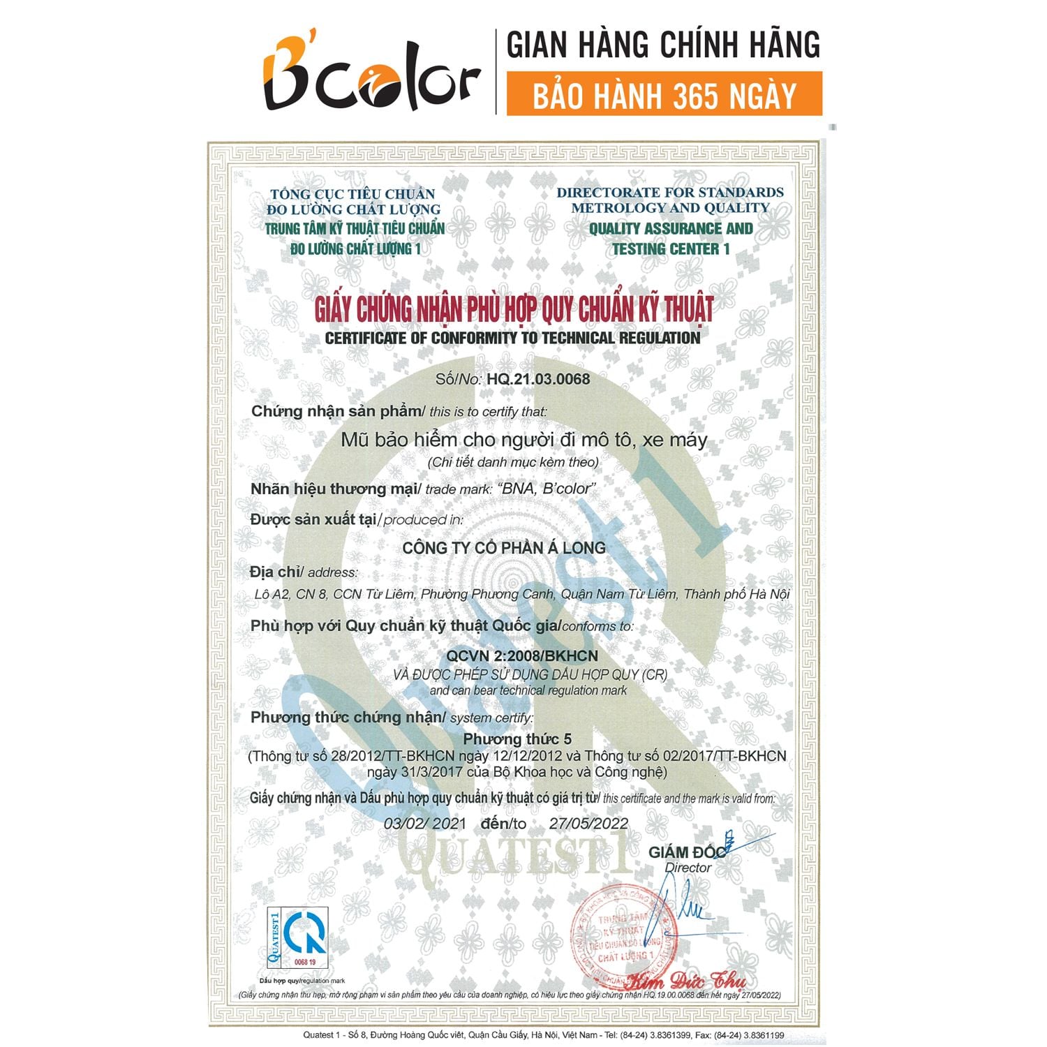 Mũ bảo hiểm B'color đã được kiểm định bởi CỤC TIÊU CHUẨN AN TOÀN CHẤT LƯỢNG