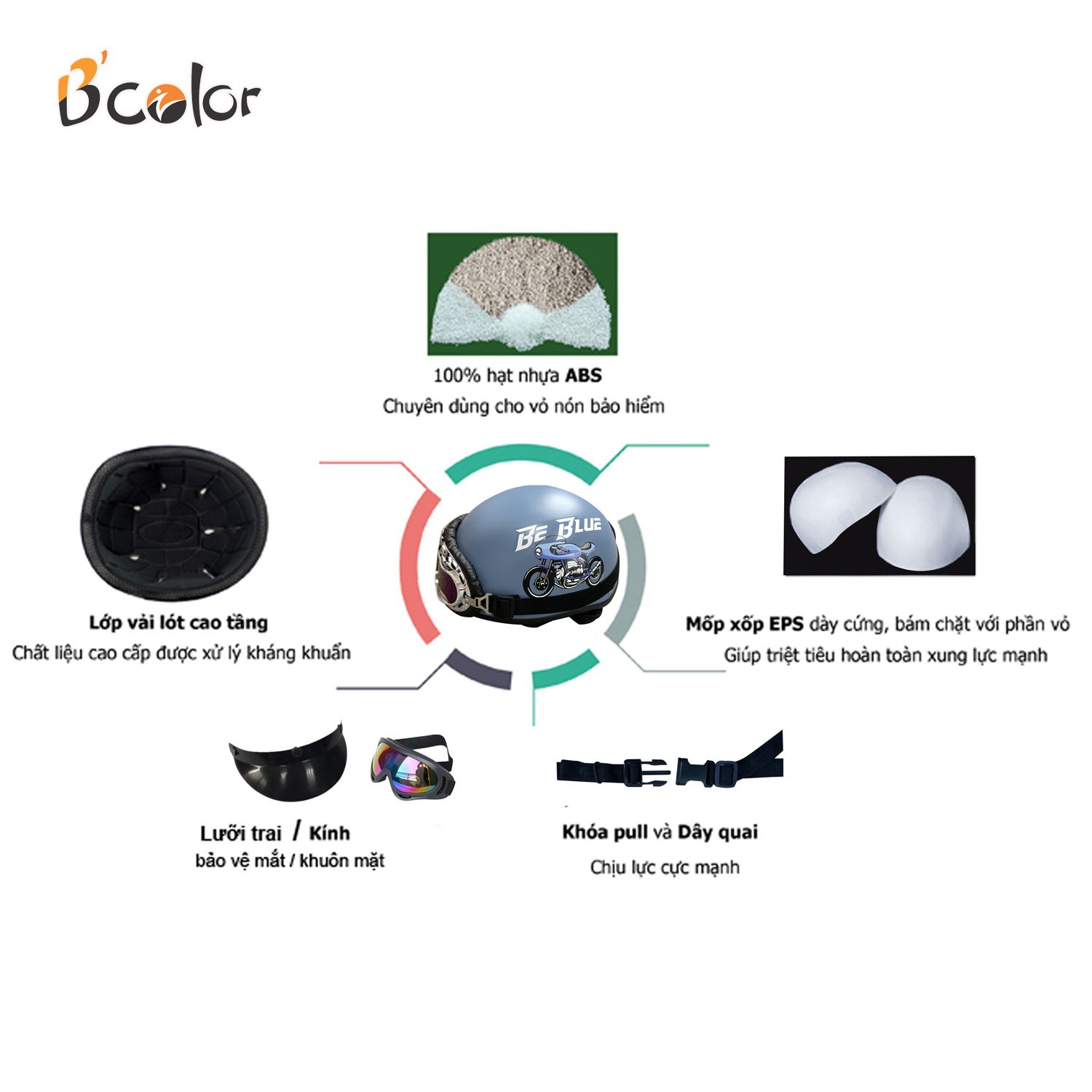 B’Color là nhãn hiệu mũ bảo hiểm dành cho giới trẻ, đáp ứng đầy đủ các tiêu chuẩn về kỹ thuật và an toàn do Tổng cục Tiêu chuẩn Đo lường Chất lượng cấp.